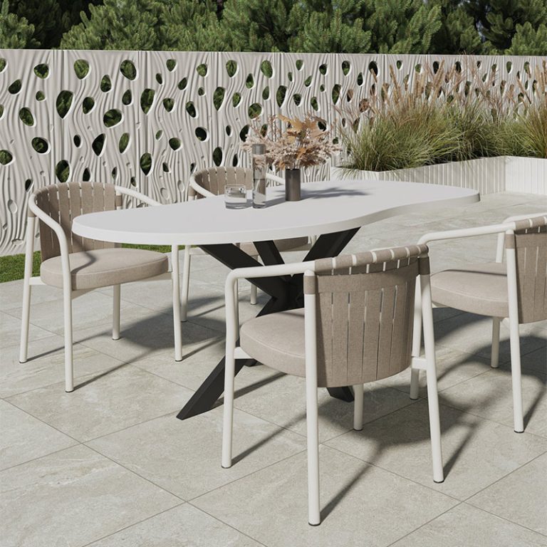 Stoły ogrodowe TEGAL, dostępne w różnych wariantach, wykonane z białego wysokowartościowego betonu WHPC TEGAL (White High Performance Concrete), to wyrazisty element wystroju, który łączy surową estetykę z wyjątkową funkcjonalnością. Betonowy blat przyciąga uwagę swoją naturalną teksturą– każdy egzemplarz to unikat, inspirowany materiałami z natury i formami współczesnej architektury.