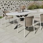 Stoły ogrodowe TEGAL, dostępne w różnych wariantach, wykonane z białego wysokowartościowego betonu WHPC TEGAL (White High Performance Concrete).